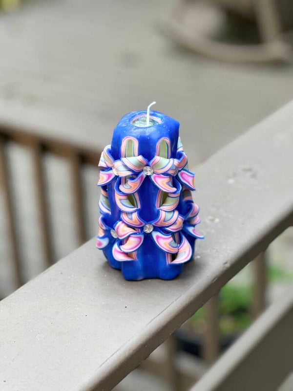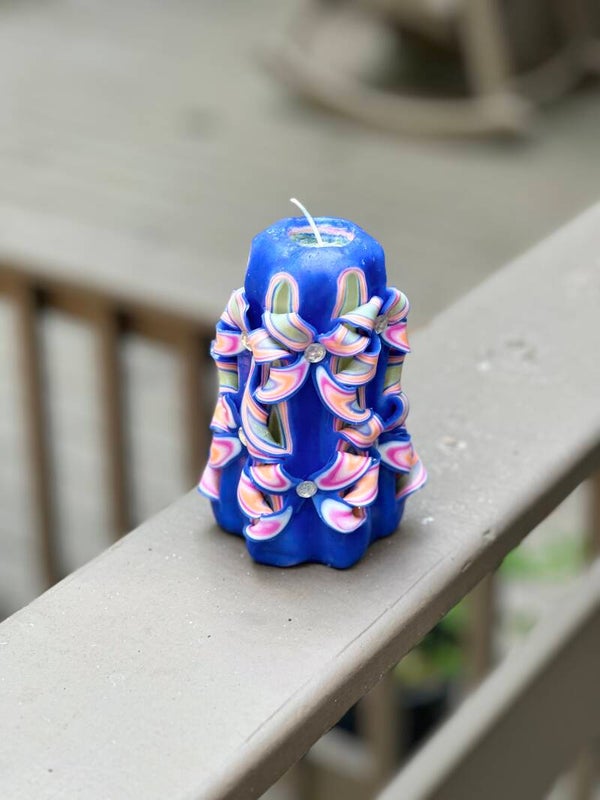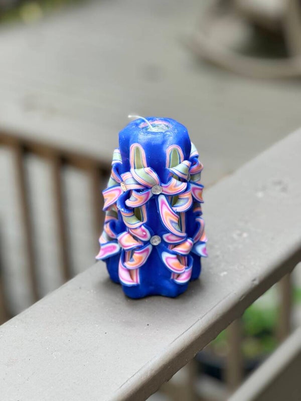 Elevate your home décor with this stunning **hand-carved candle**, meticulously crafted to blend artistry and function. Standing at **6 inches tall** and **4 inches wide**, this vibrant **royal blue candle** features intricately carved flower designs with gracefully layered petals in swirls of **pink, white, green, and purple**.