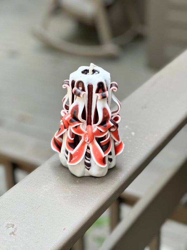 Each candle is made from high-quality paraffin wax and meticulously hand-carved to reveal intricate ribbons and swirls that celebrate your school spirit in style. The glossy finish and attention to detail make it as much a collectible as it is a décor piece.