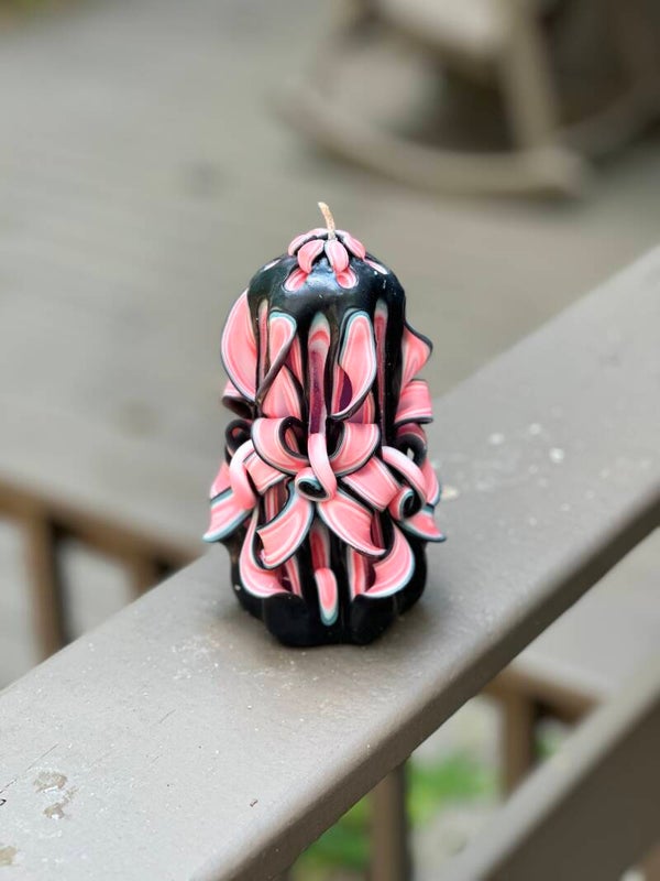 Hand-Carved Decorative Candle – 6" Tall, 4" Wide – Black, Pink & White Swirl Design