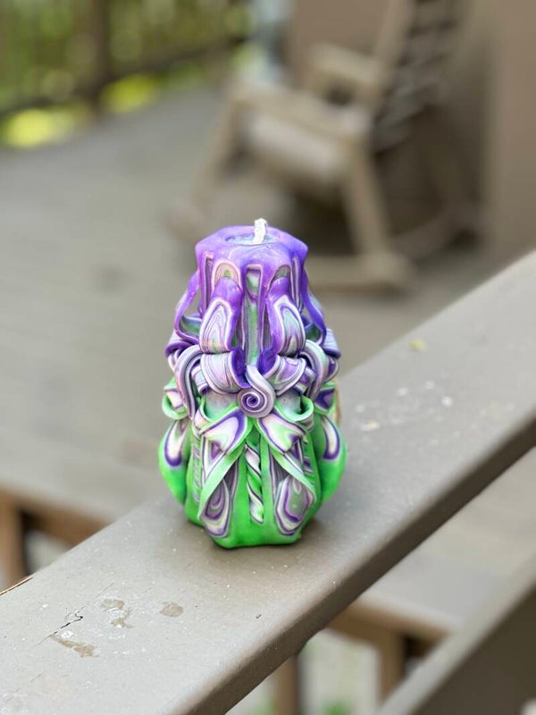 Elevate your space with the timeless beauty of this hand-carved paraffin wax candle. Standing 6 inches tall and 4 inches wide, this decorative piece features a striking black base accented with intricate swirls of pink, white, and teal. Each layer is carefully hand-carved into elegant, ribbon-like patterns that create a floral, sculptural appearance.