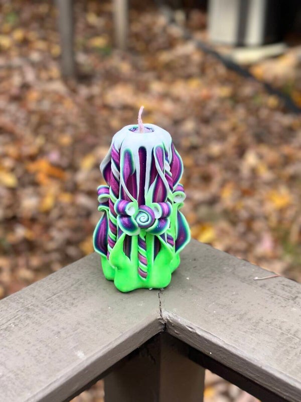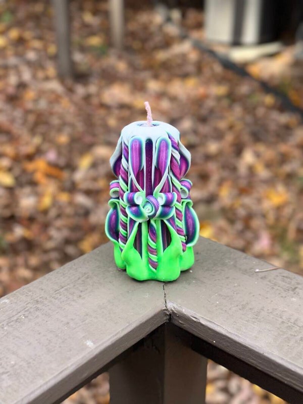 Bring a touch of handmade charm to your space with this beautifully hand-carved candle. Each candle is lovingly crafted from paraffin wax and shaped into an intricate design featuring flowing layers of green, purple, and blue. Every curve and swirl is carved by hand, making each candle completely one of a kind.