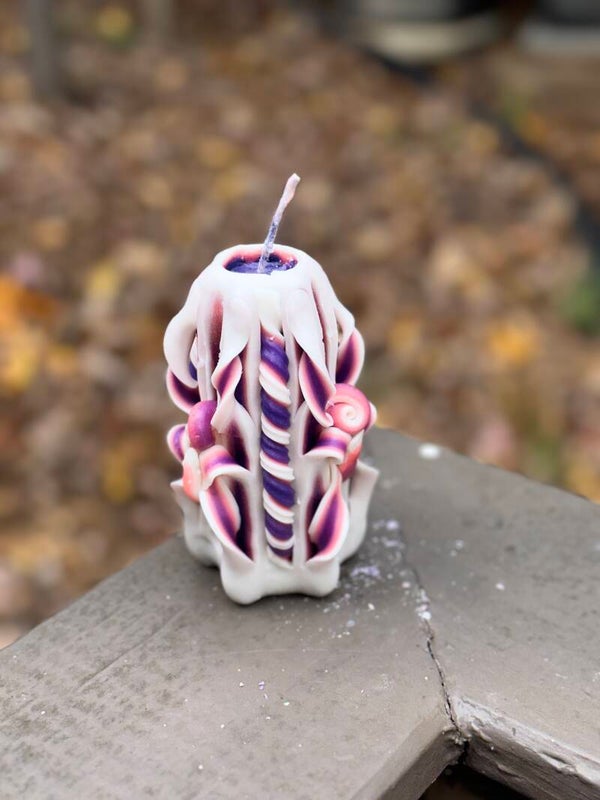 Add elegance and artistry to your space with this hand-carved candle, crafted from high-quality paraffin wax. Standing 4 inches tall and 2 inches wide, this intricately designed candle features a mesmerizing blend of purple, pink, and white hues, shaped into flowing, ribbon-like carvings that resemble delicate petals and loops.