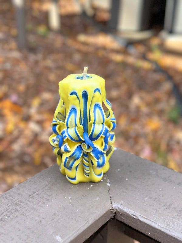 Like a burst of color captured in wax, this 6-inch tall, 4-inch wide hand-carved candle feels straight out of a fairytale. Swirls of blue, yellow, and white dance together in layers, sculpted into graceful curves and delicate folds that bloom like petals.