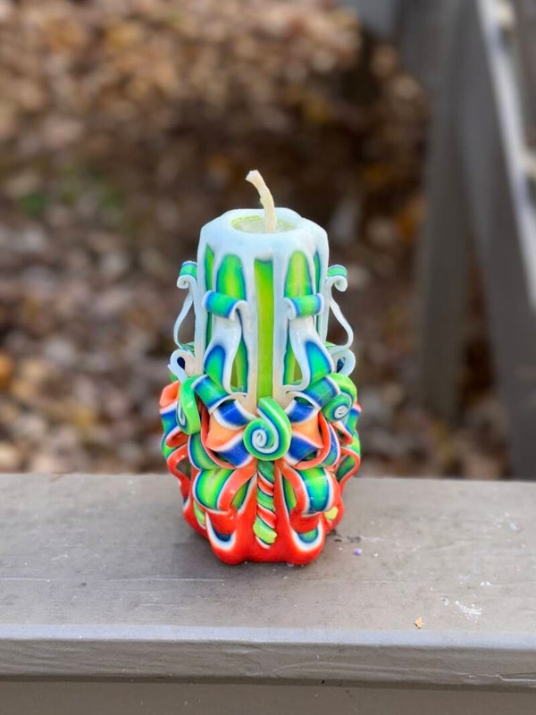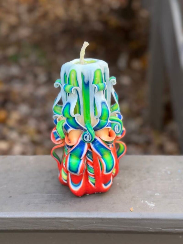 Bring vivid artistry and warm ambiance into your space with this stunning hand-carved candle. Standing 6 inches tall and 4 inches wide, it showcases intricate cutwork and flowing ribbons of color—vibrant greens and blues wrapped in rich red & white—that create a striking, sculptural design from every angle.