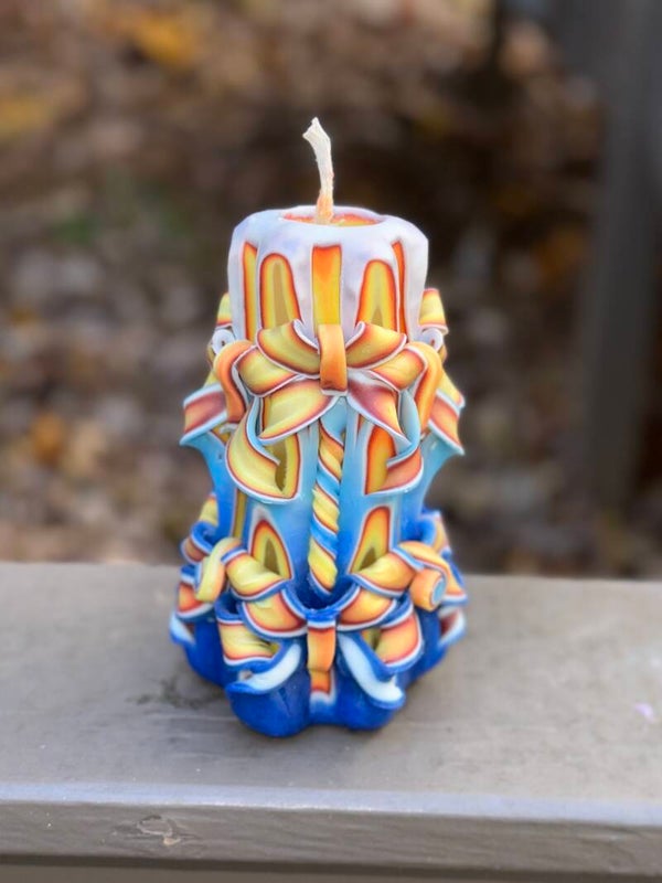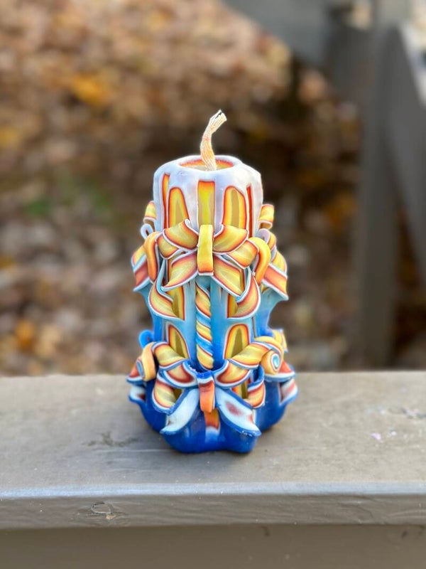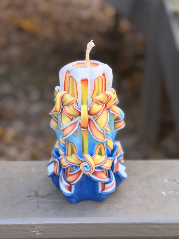 Bring vivid artistry and warm ambiance into your space with this stunning hand-carved candle. Standing 6 inches tall and 4 inches wide, it showcases intricate cutwork and flowing ribbons of — yellow and red wrapped in blue & white hues— that create a striking, sculptural design from every angle.